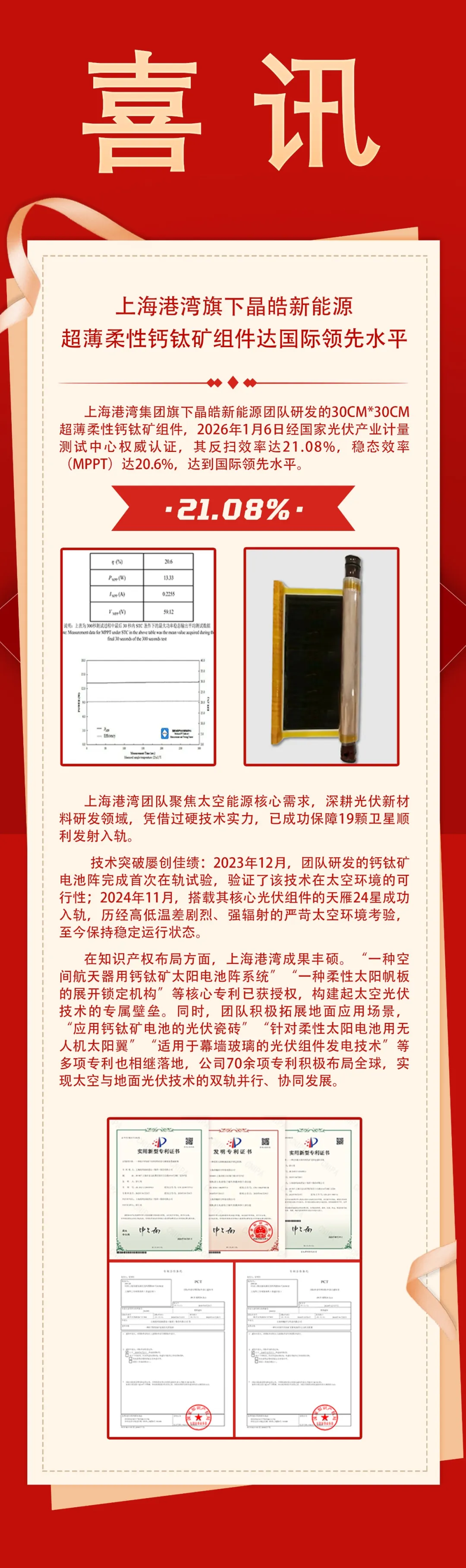 喜讯:效率突破21.08%!上海港湾旗下晶皓新能源超薄柔性钙钛矿组件开启行业新篇